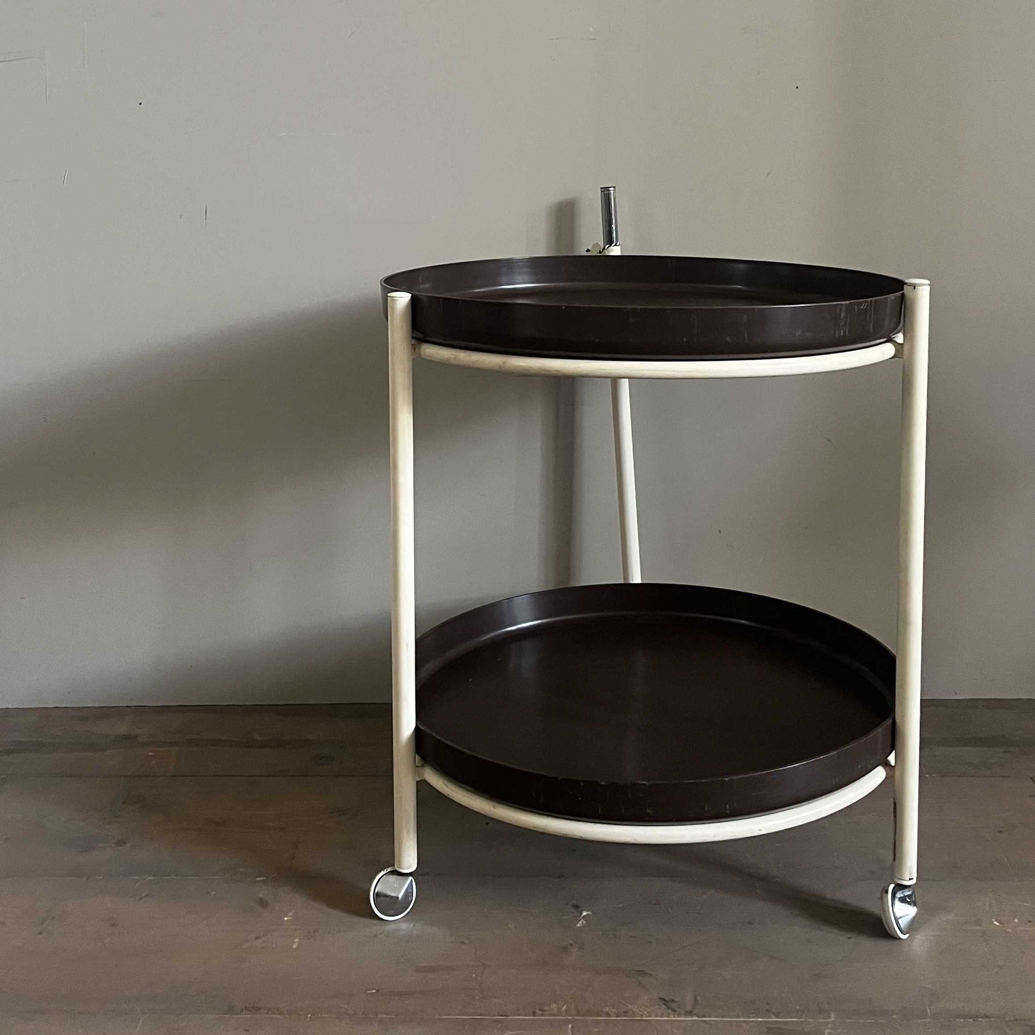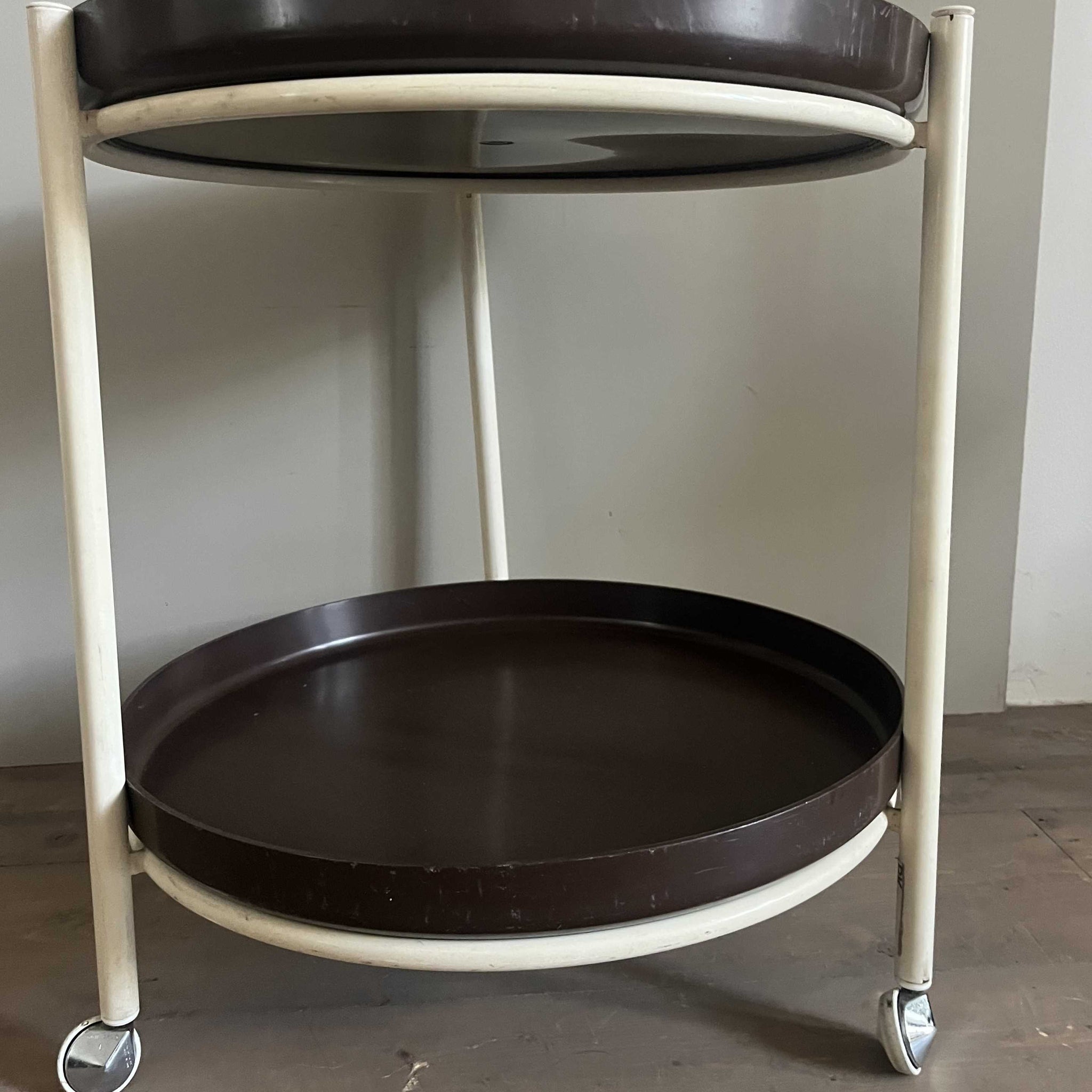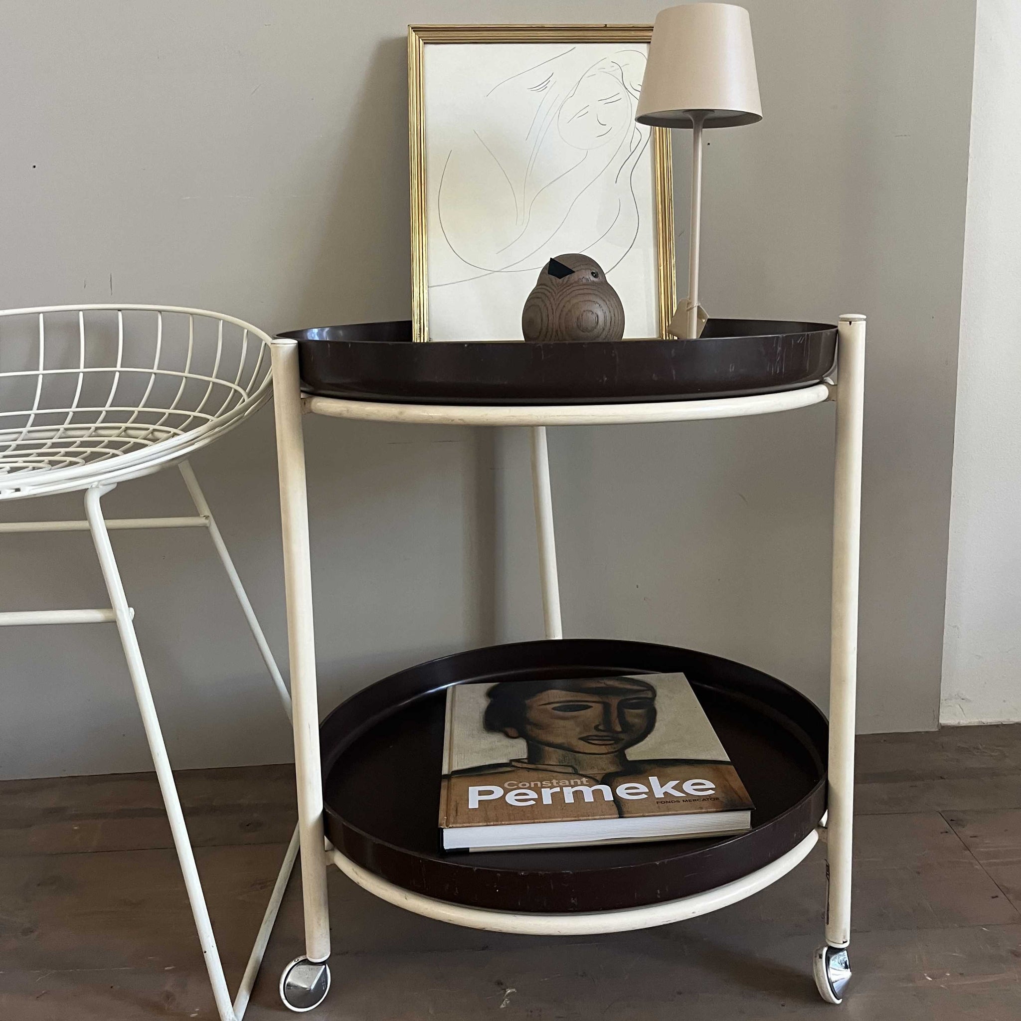 Vintage trolley uit Denemarken. Wit metalen frame met 2 uitneembare kunststof bruine dienbladen. De trolley heeft 3 wieltjes.