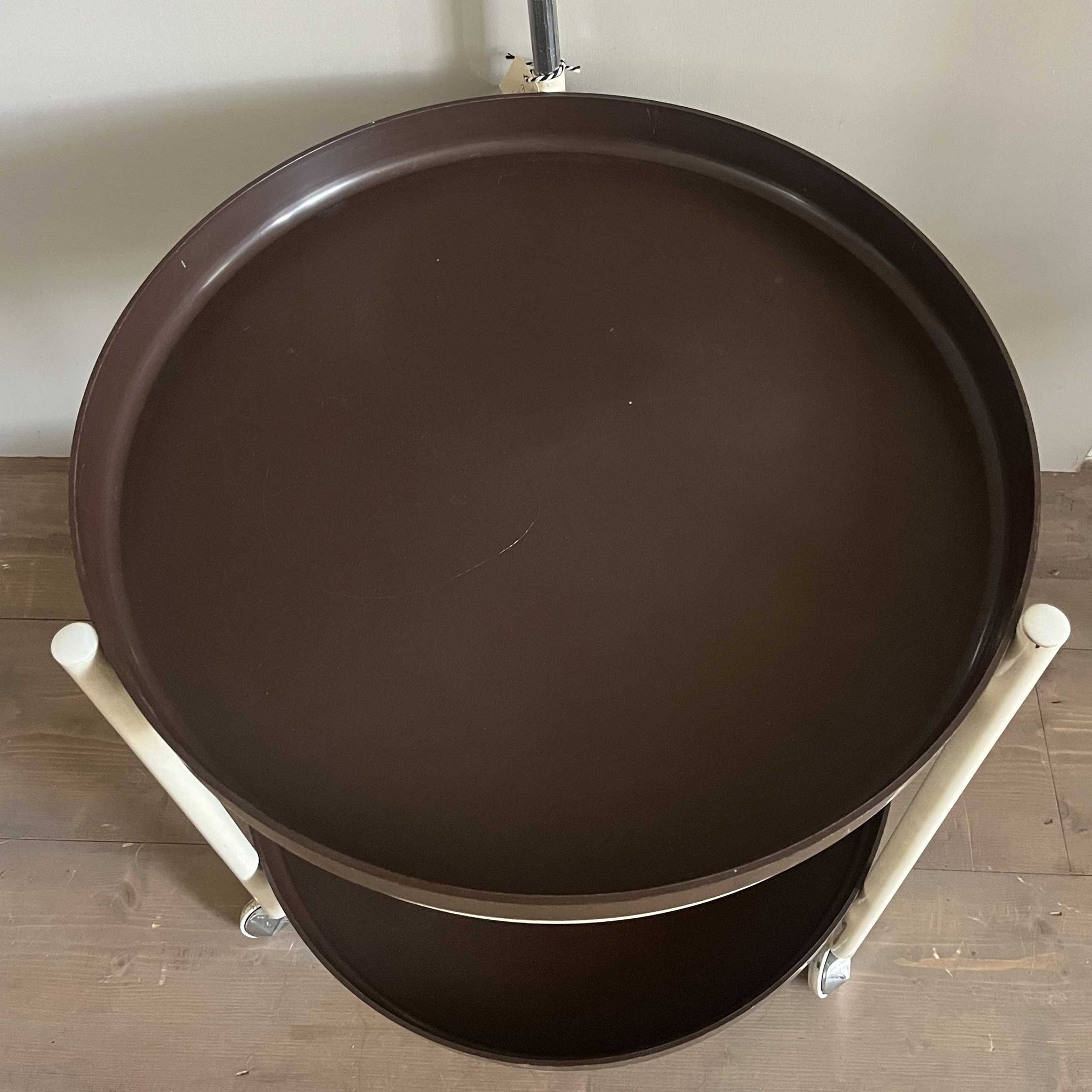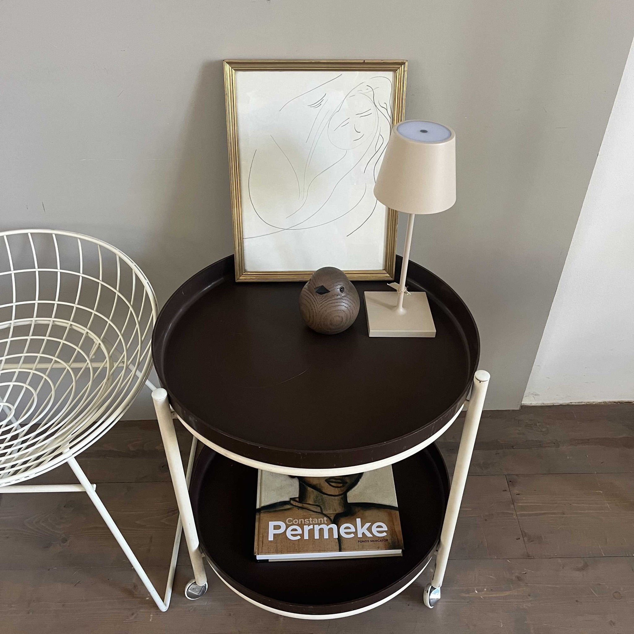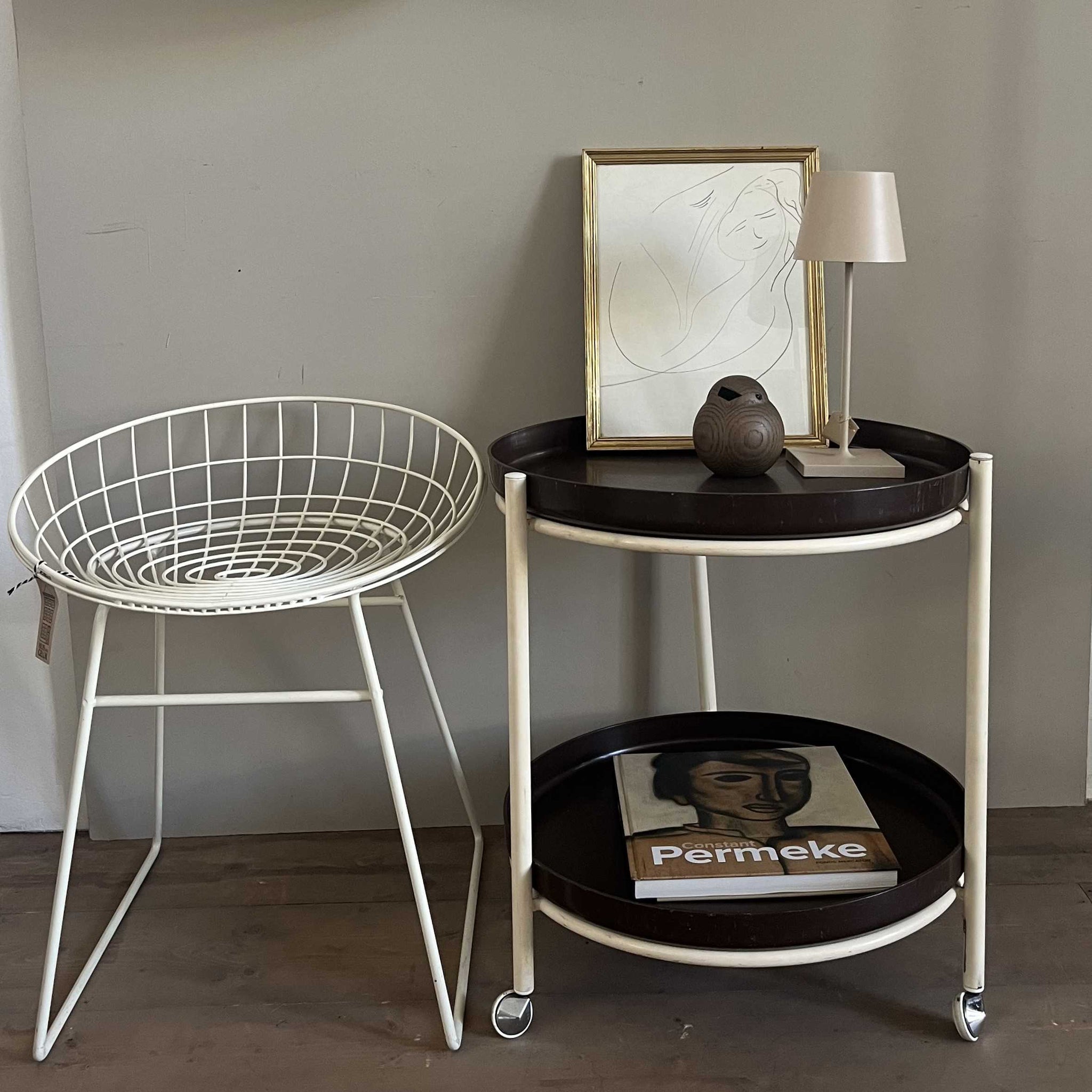 Vintage trolley uit Denemarken. Wit metalen frame met 2 uitneembare kunststof bruine dienbladen. De trolley heeft 3 wieltjes.